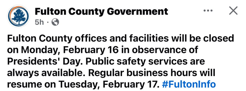 Fulton County announced that government offices and facilities will be closed Monday, February 16, in observance of Presidents’ Day, with regular operations resuming Tuesday. (Photo courtesy: Fulton County Government)